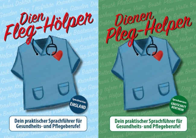 Der praktische Spracherwerb findet aber vor Ort in den Einrichtungen und Praxen statt. Hier lernen angehende Pflege- und Gesundheitskräfte aus erster Hand. Zur Unterstützung dient der vorliegende Sprachführer „Dien Fleg-Hölper“. Schülerinnen und Schüler der Klassen PFL 23.1, PFL 23.2 und PFL 23.3 haben Begriffe und Sätze aus ihrem Alltag in den Pflegeheimen gesammelt und zu einer Broschüre zusammengefasst. Dadurch ist ein praktischer Helfer entstanden, um Menschen mit ihren jeweiligen Bedürfnissen auf Plattdeutsch begleiten zu können. Die Schreibweise dieses Sprachführers beruht auf dem Werk von Josef G. Schmidt: „Use Platt van A-Z. Hochdeutsch-Plattdeutsches Wörterbuch in emsländischer Mundart“ (Verlag Alfons Gels, Meppen, 1998). Dabei mussten einige moderne Begriffe neu geprägt werden, wie z. B. „Loopwaogen“ für Rollator oder „Vörlaoge“ für Vorlage. Die Zusammenstellung des Dokuments und das Lektorat erfolgten durch die Fachstelle Plattdeutsch der Emsländischen Landschaft e. V. für die Landkreise Emsland und Grafschaft Bentheim.