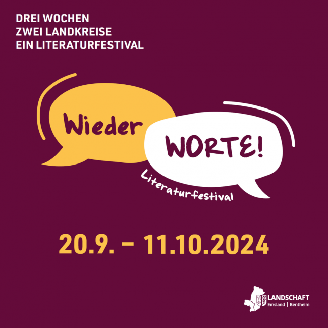 Vom 20. September bis zum 11. Oktober 2024 lädt die Emsländische Landschaft e.V. für die Landkreise Emsland und Grafschaft Bentheim zu ihrem ersten Literaturfestival ein. „Wieder WORTE!“ entstand in enger Zusammenarbeit mit den Landkreisen Emsland und Grafschaft Bentheim sowie den Städten Papenburg, Meppen, Lingen und Nordhorn mit dem gemeinsamen Ziel, ein breites Publikum aller Altersgruppen für Literatur zu begeistern.